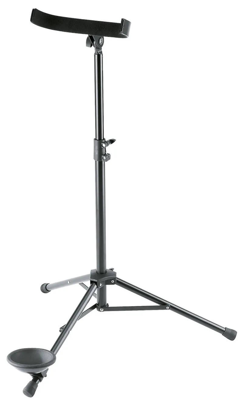 The metal support bracket holds the instrument securely and the large felt support protects the surface of the contrabassoon. The large rubber coated support cup provides a secure stand for the instrument.