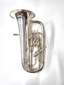 The Boosey and Hawkes Imperial Euphonium was originally brought out as Boosey and Hawkes top of the line Euphonium model to please artists and professionals all around the world. The serial number (63xxxx) dates the instrument to being manufactured in roughly the last 1970s/ early 1980s. These instruments blow beautifully with a full and direct tone, and will service any professional player well.