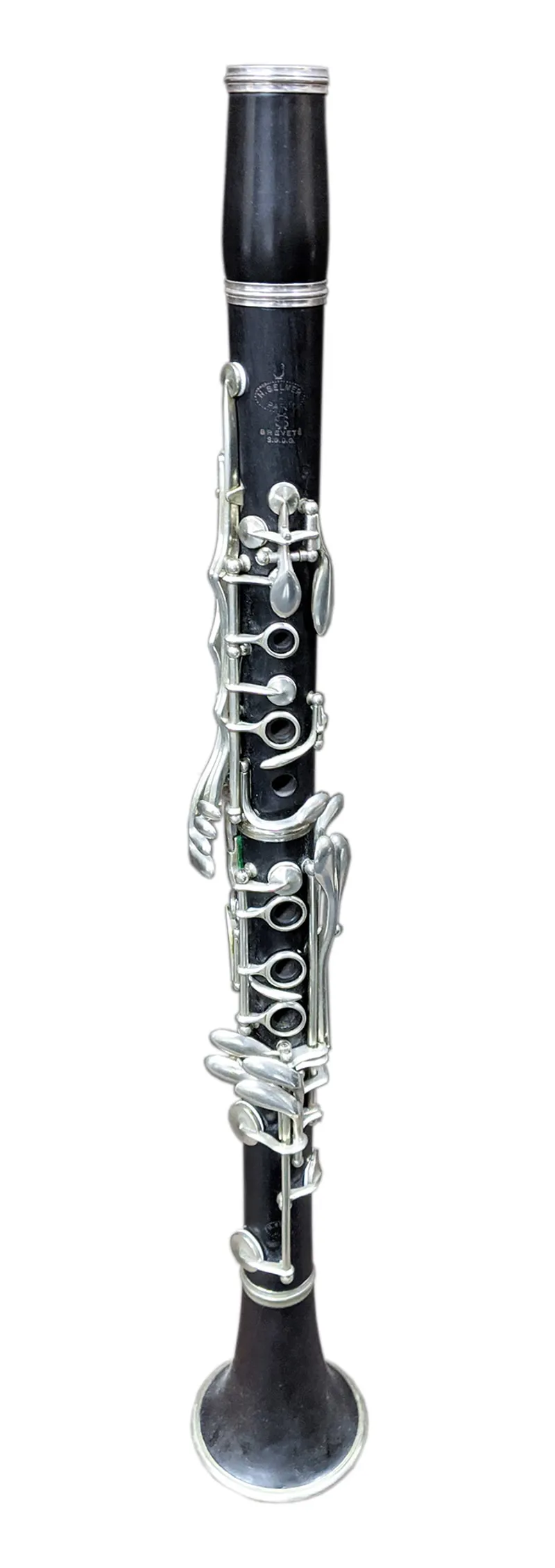 This vintage Clarinet is stamped with the Selmer Paris logo, the word Brevete and S.G.D.G. underneath, meaning ‘patent’ in French.